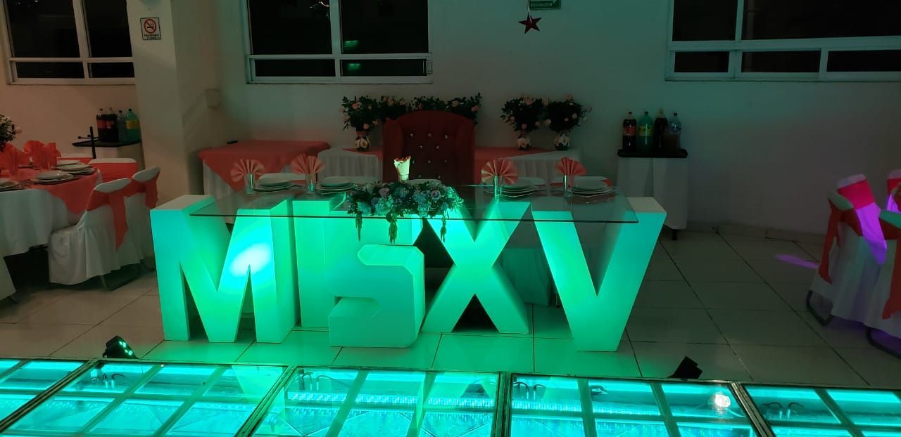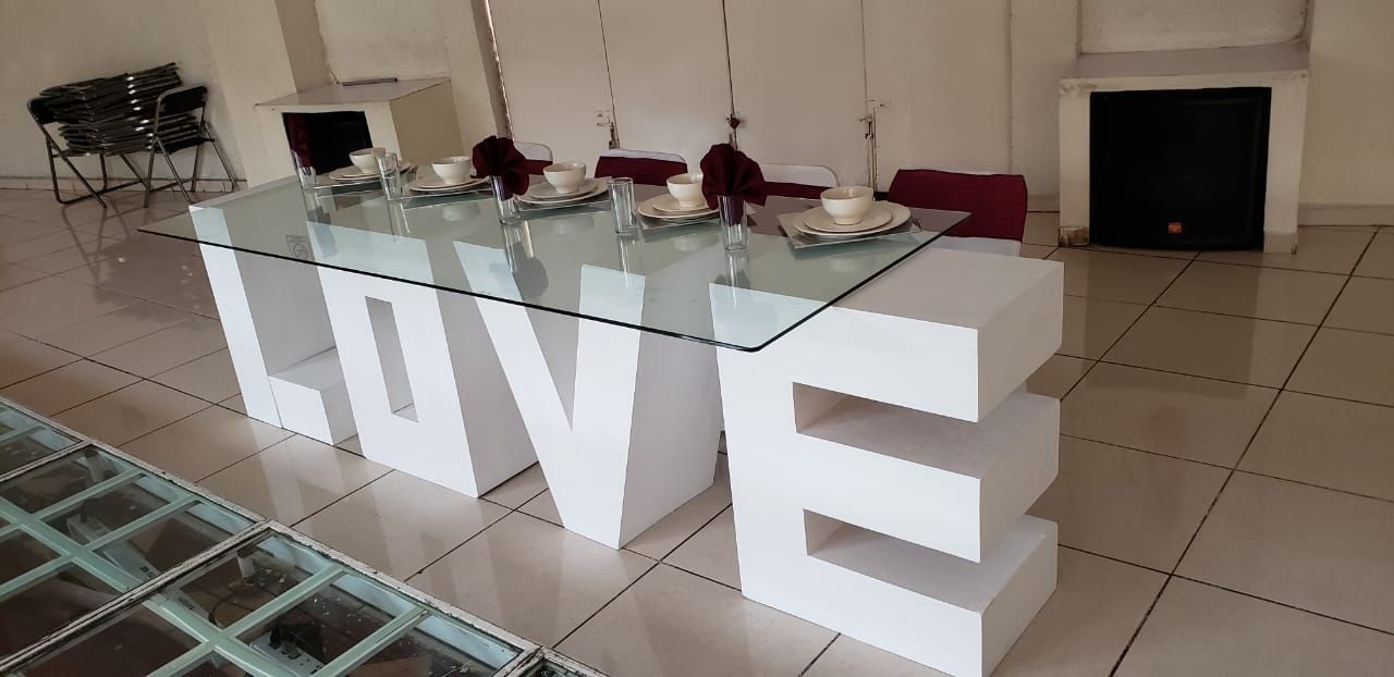 • Montaje para 50 personas, con mesas, sillas, mantel, cubre-mantel, mesa para pastel, mesa para regalos y 2 tablones para barra de alimentos.